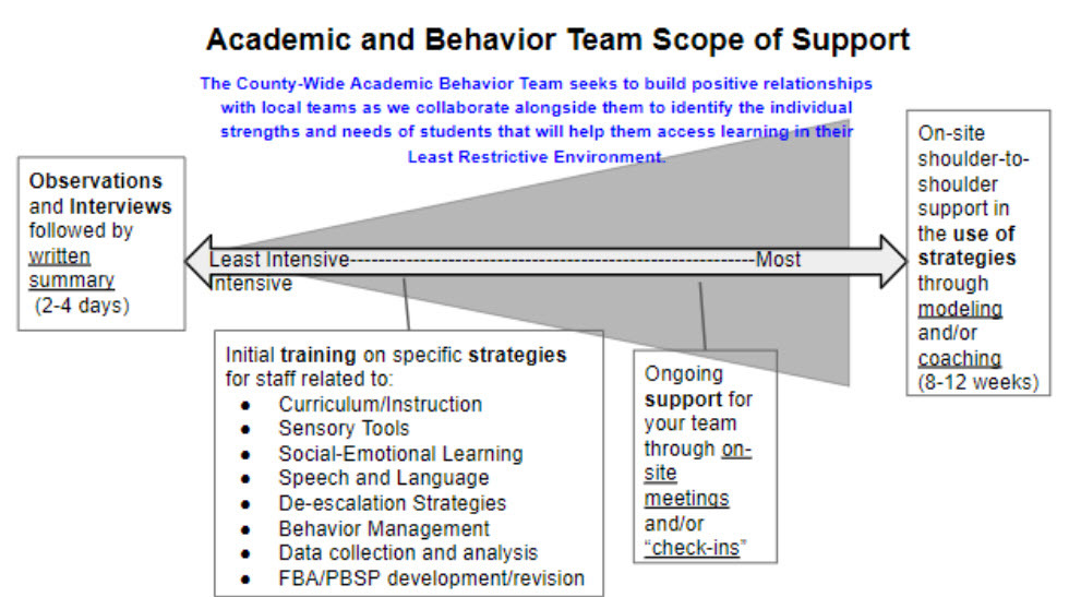 The County-Wide Academic Behavior Team seeks to build positive relationships with local teams as we collaborate alongside them to identify the individual strengths and needs of students that will help them access learning in their Least Restrictive Environment.